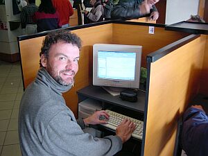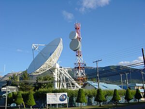 Me updating the webpage in Coyhaique. We wondered about the fast Internet connection in the small town of Coyhaique. After we saw this Antennas, we knew why.