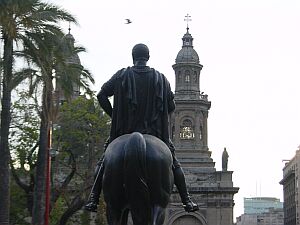 03/17 Plaza de Armas. The guy on the horse is Pedro de Valdivia, the founder of Santiago, in the background, you see the Iglesia de Santo Domingo. We stayed in una casa familia about 20 m from there