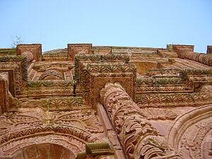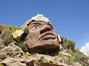 04/18 A huge indio face in the stone beside the street guards the city of Chucuito.