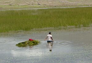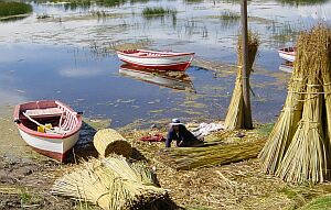 04/18 Near to Puno, women are working with reed to build the typical lake Titikaka boats.